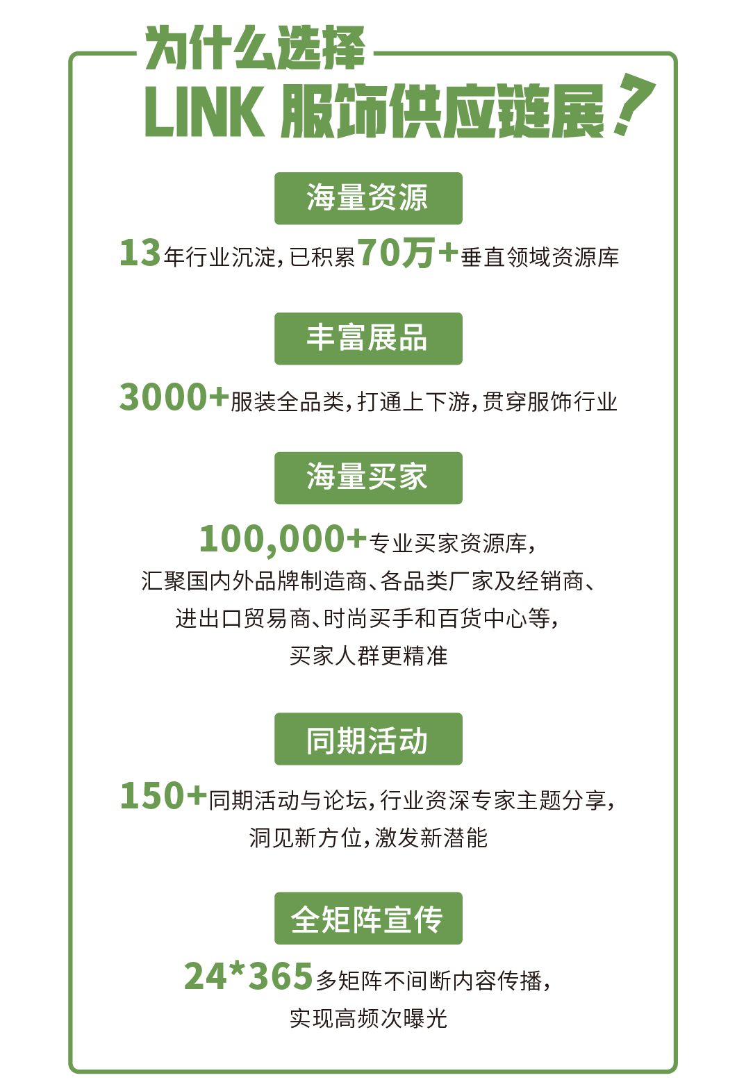 LINK 服饰供应链展是专注于服饰供应链领域发展的专业B2B展,聚焦纺织服装上下游精准对接。展品涵盖成衣优质制造、时尚创造、配饰箱包、面辅料及源头材料、服饰电商及供应链服务,贯穿服饰全产业链。