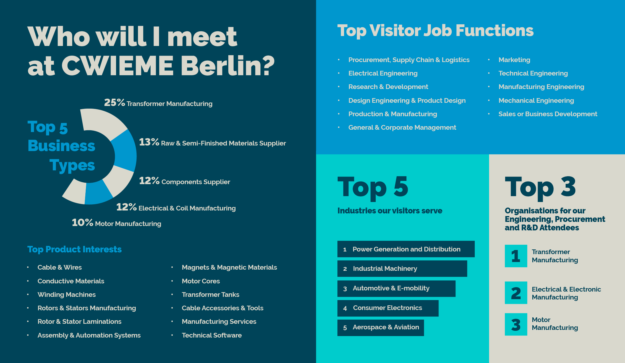 CWIEME Berlin是全球最大的线圈、电机、变压器及绝缘材料专业展览会之一,自1995年创办以来,至今已经成功举办28届,成为电气装备、电机、变压器制造领域的专业展览会。展会聚焦电磁线圈、电机制造、绝缘材料及电动汽车技术,覆盖从原材料、设备到成品的完整产业链,吸引全球制造商、工程师及采购商参与。作为欧洲电气工业的风向标,CWIEME Berlin为参展企业提供拓展欧洲市场、对接国际买家的首选平台。