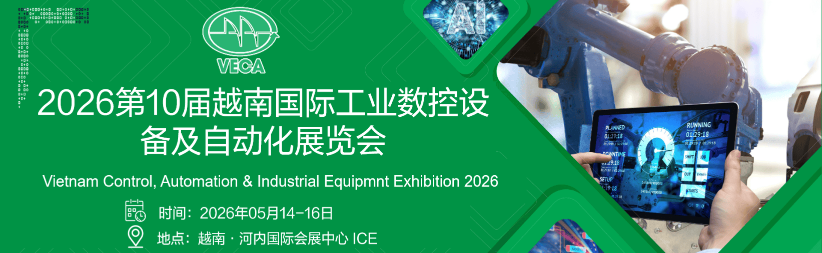 2026越南国际工业数控设备及自动化展览会(VECA2026),由越南自动化协会与越南广告博览公司联合主办的专业自动化展。展会涵盖数控设备、工业自动化、工业机器人、人工智能、智能工厂、智能传动等方面的相关产品。展会面向越南北方地区主要工业制造产业集群市场,采用专业展览+特邀采购对接+本土工厂拜访+专业市场考察等多项供需对接活动的形式联合举办。展会每年在越南河内市及胡志明市联展各举办一届。上届河内展,吸引来自越南及中国、德国、印度、泰国、巴基斯坦、老挝、中国台湾等16个国家和地区的企业参展参会,登记专业观众9742名,是越南北部地区重要的工业制造细分化专业展览会。