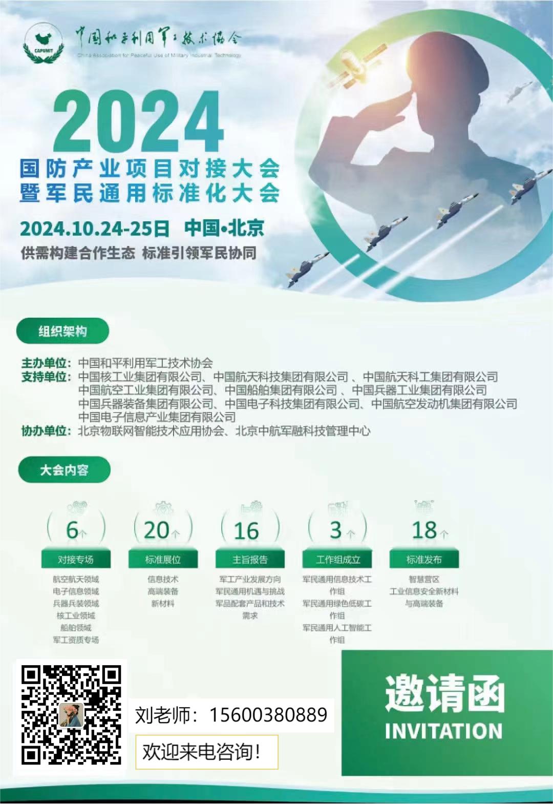 为贯彻落实党中央、国务院关于“推动产业链上中下游、大中小企业融通创新”的决策部署,按照《工业和信息化部等十一部门关于开展“携手行动”促进大中小企业融通创新(2022-2025年)的通知》(工信部联企业〔2022]54号)、《工业和信息化部办公厅等四部门关于开展2024年“百场万企”大中小企业融通对接活动的通知》(工信厅联企业函[2024]174号)的要求,进一步推动军民融合高质量发展,加快形成新质生产力,中国和平利用军工技术协会定于2024年10月24日-25日,在北京市召开国防产业项目对接大会暨军民通用标准化大会。