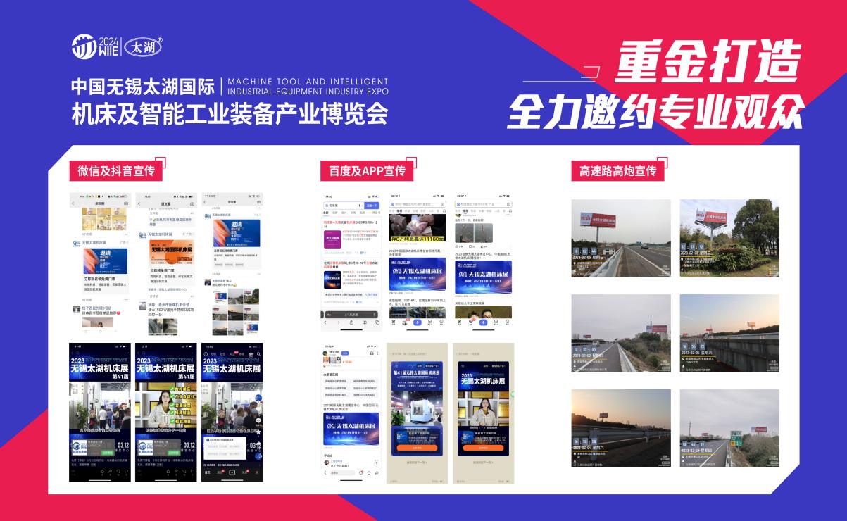 线下宣传同样不遗余力,在无锡周边高速公路及市区主干道设置高速高炮广告、宣传横幅、喷绘广告、空飘气球广告、出租车公交车身广告等户外广告,全面覆盖重点场所。同时,在《金属加工世界》《机床与装备》《CNC刀具世界》《机床工具制造业》等 50 多家专业媒体杂志,以及《中国机床商务网》《中国金属加工在线网》《机电在线》等 500 多家专业网站媒体、微博、独立强大的观众微信平台等进行定时推广,并借助无锡电视台、无锡广播电台等大众媒体进行密集宣传。通过线上线下紧密结合的宣传方式,形成全方位、高覆盖、高精度的宣传矩阵,确保展会信息精准触达目标群体,吸引更多专业观众和潜在客户。
