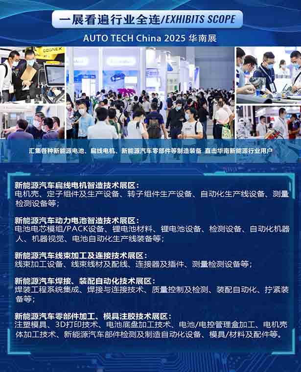2025 第五届广州国际新能源汽车产业智能制造技术展览会以“能源绿色化,制造低碳化”为主题,划分为新能源汽车的锂电池、电机、电控、线束加工、视觉检测、注塑技术、车身焊接与装配自动化等智能制造技术专题展,展品涵盖了新能源汽车产业链的方方面面,为新能源行业嘉宾奉献一场豪华的视觉盛宴。