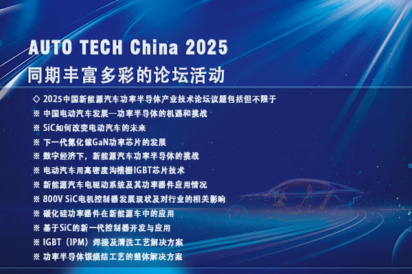 AUTO TECH China 2025 广州国际新能源汽车功率半导体技术展览会是一个汇聚行业精英、展示创新成果、促进合作交流的重要平台。在这里,你将感受到新能源汽车功率半导体行业的无限活力和广阔前景。让我们共同期待展会的到来,一起为新能源汽车功率半导体行业的发展贡献力量,共同绘制行业的新蓝图。广州保利世贸博览馆,2025年11月20日至22日,期待您的莅临!更多精彩等待您现场解锁!详情请登录:www.china-autotech.com 参展联系人:黄先生133 3289 9255 jasonhuang@jswatsonexpo.com/ 参观联系人:汪女士177 2452 1438 wangcuiping@jswatson-expo.com