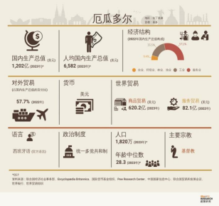 中国是厄瓜多尔第二大贸易伙伴,厄瓜多尔是中国在拉美第八大贸易伙伴。厄瓜多尔是中国的全面战略伙伴,也是“一带一路”共建国家。2023年厄瓜多尔国内生产总值1,202亿美元,人均国内生产总值6582美元。世界贸易中商品贸易达620.2亿美元。