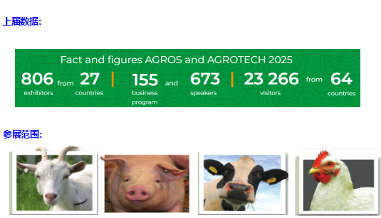 畜牧养殖设备及技术、育种方案、繁殖技术·饲料、饲料添加剂、饲料生产和存储·动物健康、兽药和卫生及医疗·动物畜舍和谷仓建设·挤奶和冷却技术·粪肥、固体和液体肥料·运输车辆和服务·加工和销售·生物质能·