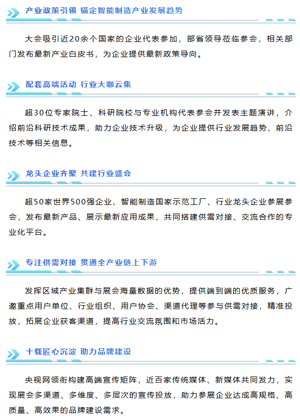 本届博览会将以会展融合的形式,围绕智能机器人、智能工厂、智能制造系统解决方案及标准、数控机床、智能检测装备、工业软件等智能制造相关领域,结合省市区域特色与优势产业,重点展示各行业智能制造升级过程中的新成果、新技术、新特精产品、通用设备与技术;为国内外院所、机构、企业搭建智能制造领域国际交流合作、行业趋势发布、技术产品对接、Zui新成果展示、产业发展投资、高端人才集聚的对接交流平台,共同推动工业制造的转型升级。
