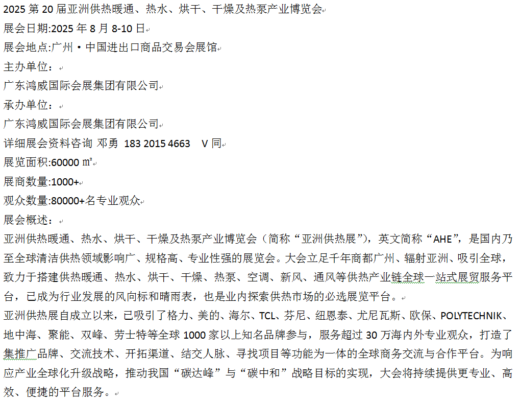 中国供热产业持续创新和技术进步,促进了供热行业良性的发展,为全面推广供热产业的应用,由广东鸿威国际会展集团有限公司主办的“2025亚洲供热暖通、热水、烘干、干燥及热泵产业博览会(AHE)”将于2025年8月8日-10日在广州琶洲展馆隆重举办!AHE2025预计展览面积60000多平方米,将吸引800多家参展商,以及来自国内外的40000多名专业观众共赴盛会。亚洲供热展是国内外品牌拓展,中国市场的重要通道,是布局全球网络的最佳渠道,是供热行业年度新品发布重要平台及贸易导向。
