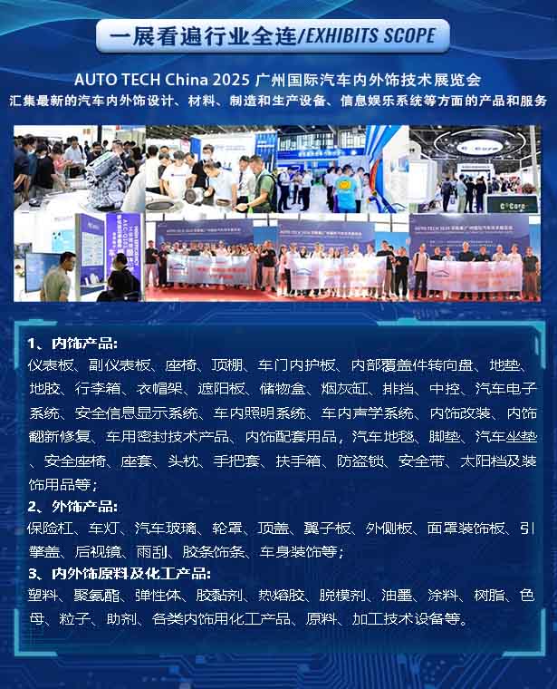 2025年11月20-22日在广州举办的AUTO TECH China 2025 广州国际汽车内外饰技术展览会,是一场汇聚了国内外众多知名企业和行业专家的盛会。展会将展示汽车内外饰领域的最新产品、技术和解决方案,为企业提供一个交流合作的平台。
