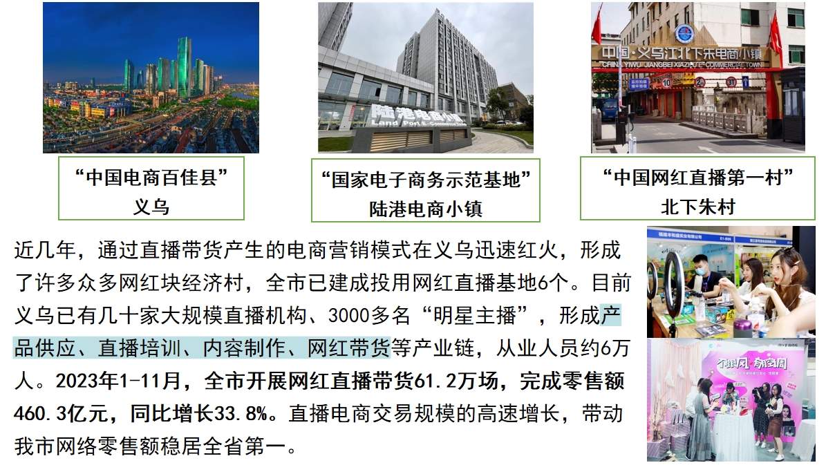 依托义乌商贸市场为基础,义乌电商高速发展已连续多年蝉联“中国电商百佳县”榜首,2022年义乌电子商务交易额3907亿元,2022年义乌邮政和快递业务总量累计完成93亿件,居全国第二。全市电子商务经营主体超52万家,义乌内贸网商密度列全国城市排名第一,外贸网商密度列全国城市排名第二,义乌常驻境外客商达15000余名。